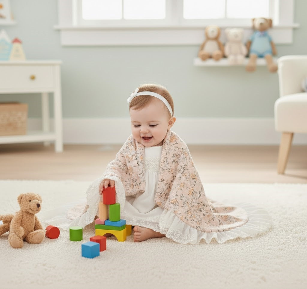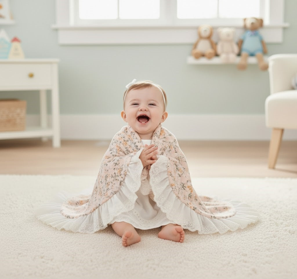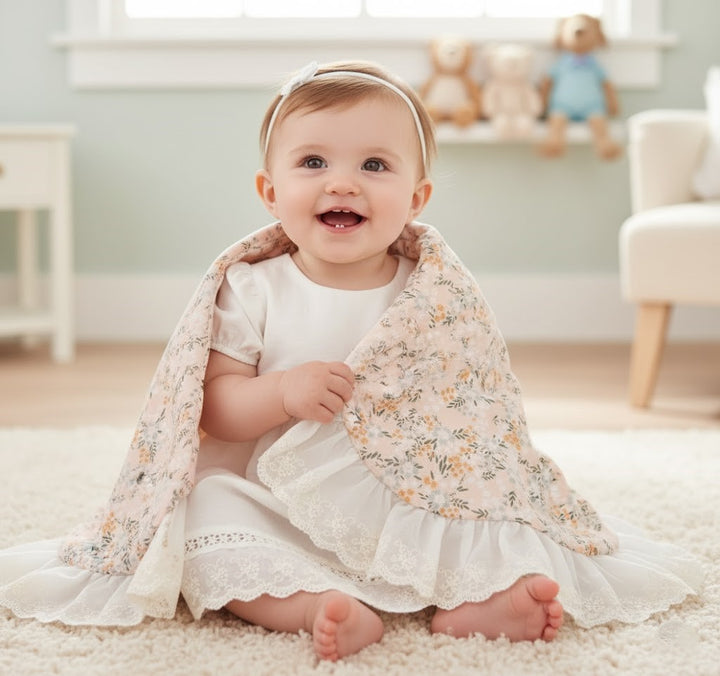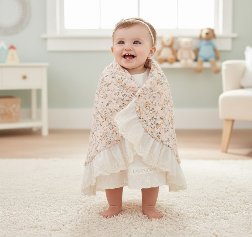 Blanket size is 28X28 inches with 2 1/2" ruffles around."Wrap your little one in cozy comfort and delicate charm with our cotton and lace ruffle receiving blanket. Crafted from soft, breathable cotton, this blanket provides a gentle embrace for your baby, ensuring warmth and security during precious moments of rest and relaxation. The whimsical lace ruffles adorning the edges add a touch of timeless elegance, creating a lovely frame for your bundle of joy. Perfect for swaddling, cuddling, or as a stylish accessory for outings, this blanket is both practical and beautiful, making it an essential addition to any nursery or baby's layette."