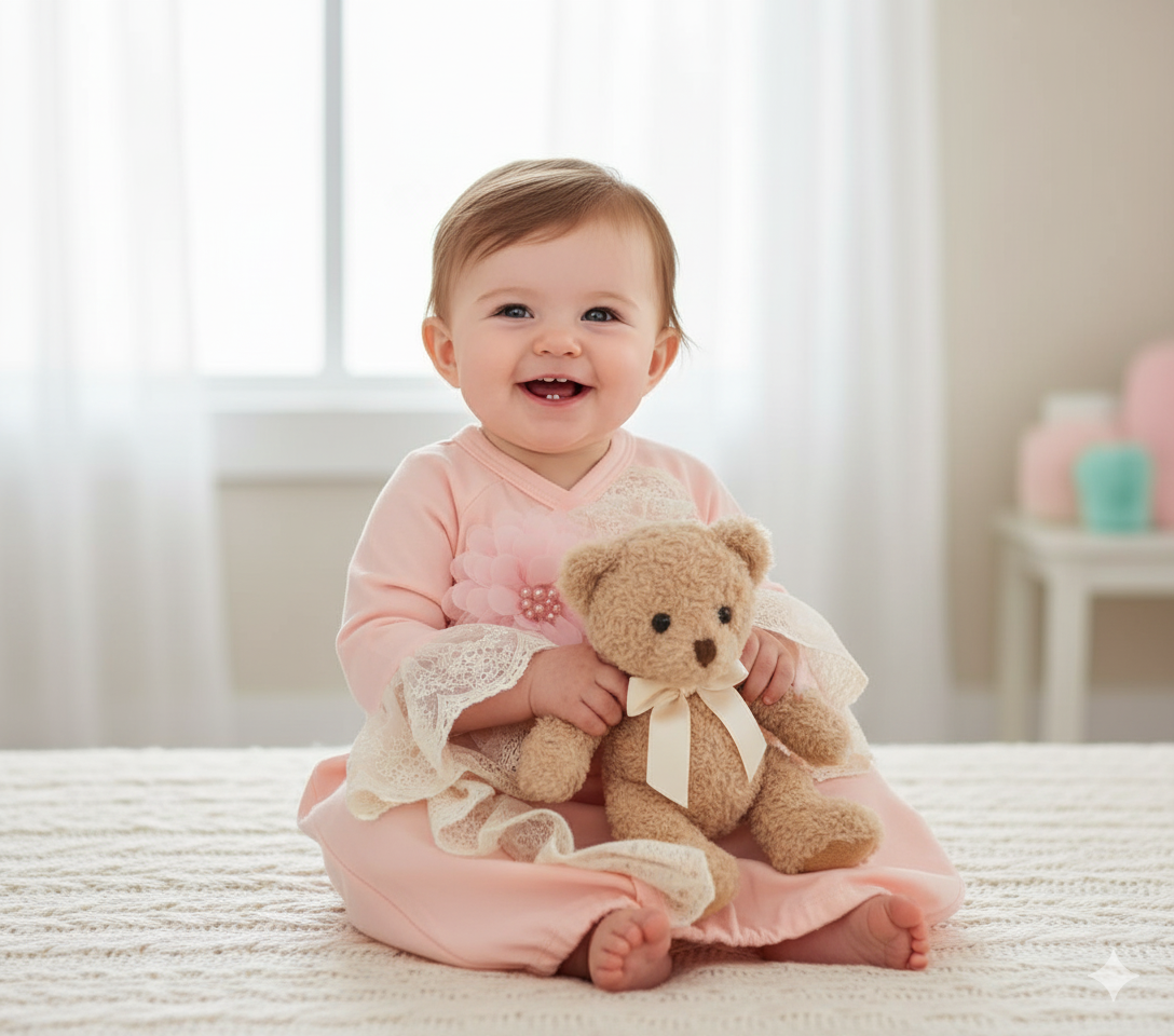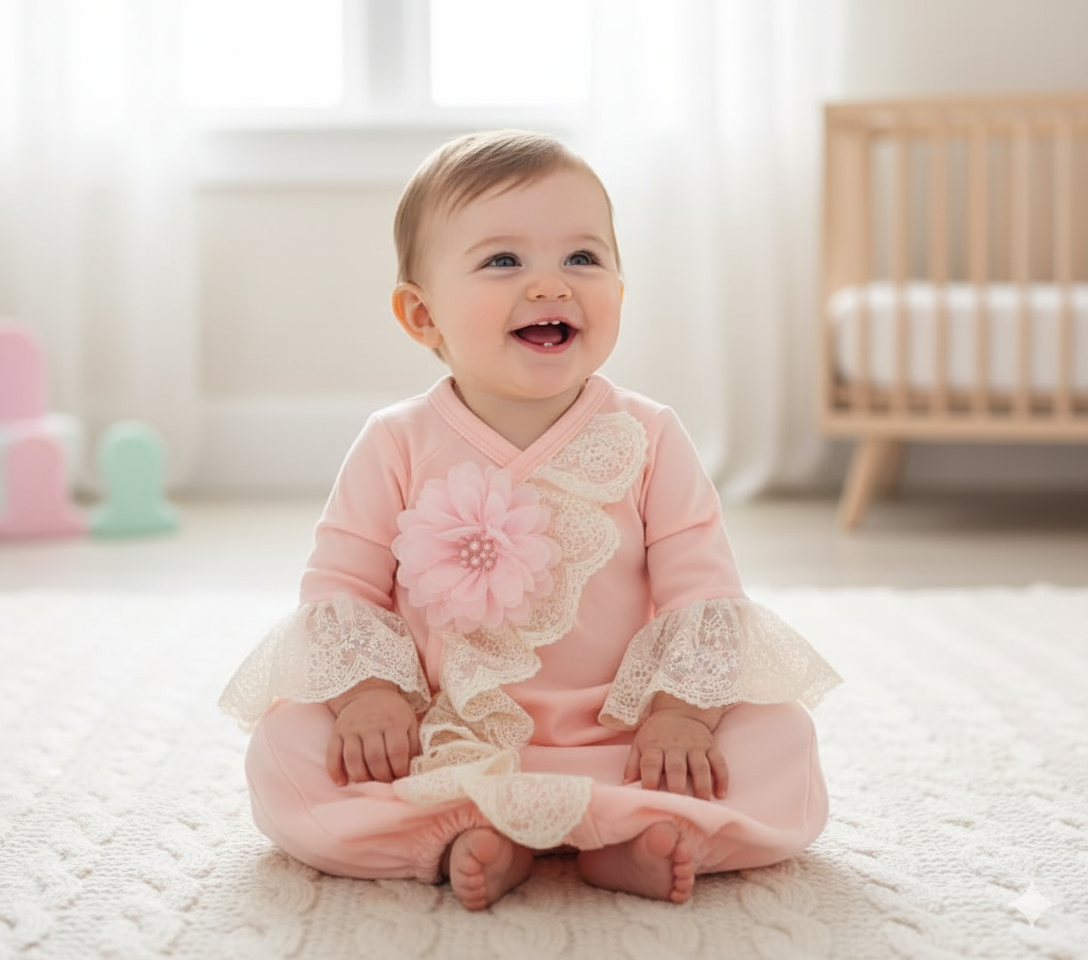 CHIC PETIT Baby Girls Take-me-home Gown. Elevate your baby's style with the Chic Petite Baby Gown by Haute Baby. This stunning gown, adorned with soft pink roses, exudes timeless elegance. Pair it with our matching Chic Petite Baby Cap and Blanket for an irresistible look. Crafted with care, it offers a comfortable fit for babies, toddlers, and children. Easy to care for, machine wash cold and lay flat to dry. Make a statement with the Chic Petite Baby Gown and let your baby shine in sophistication.