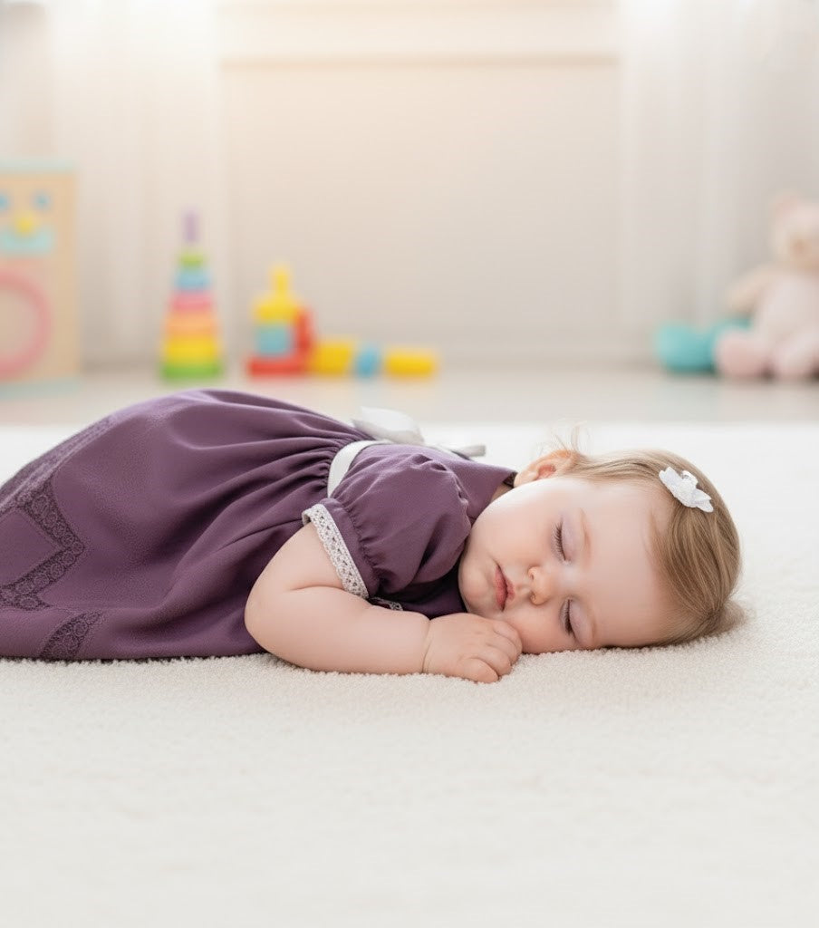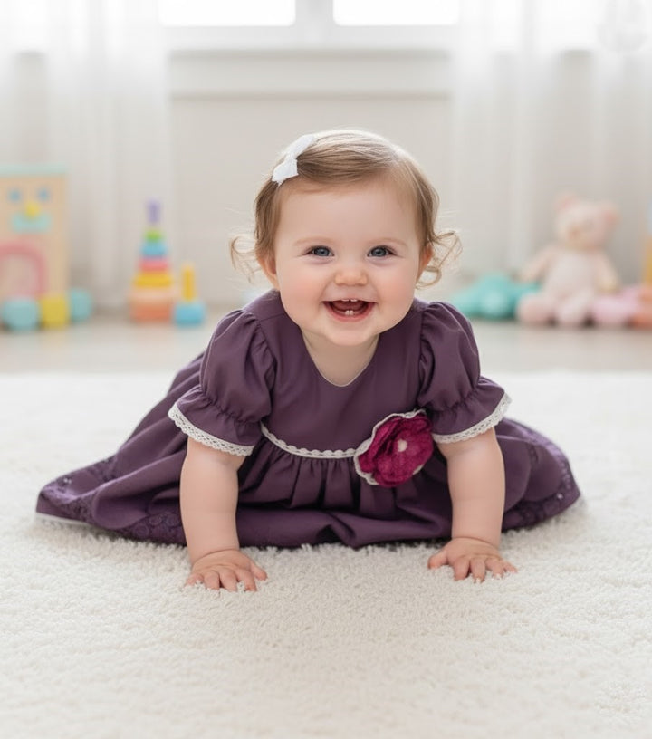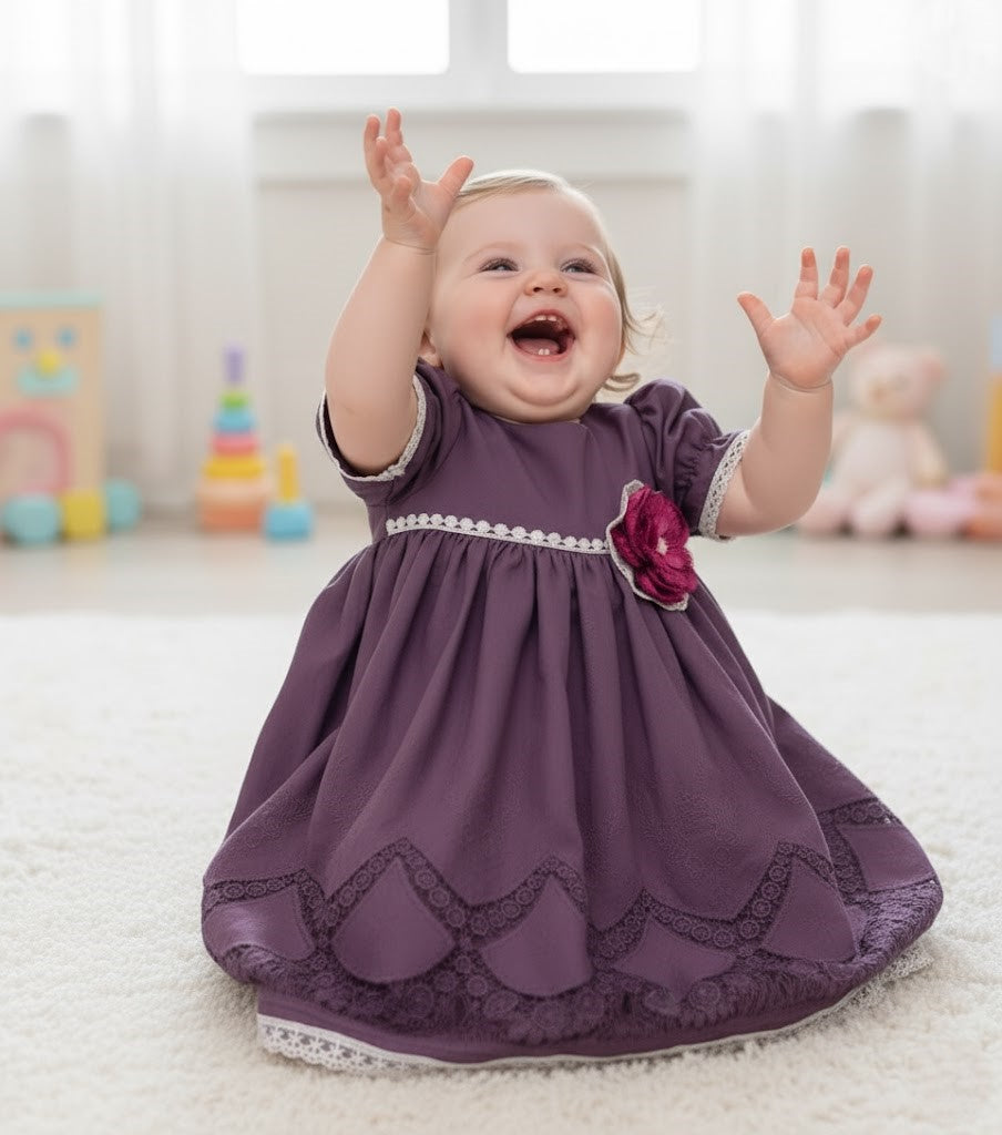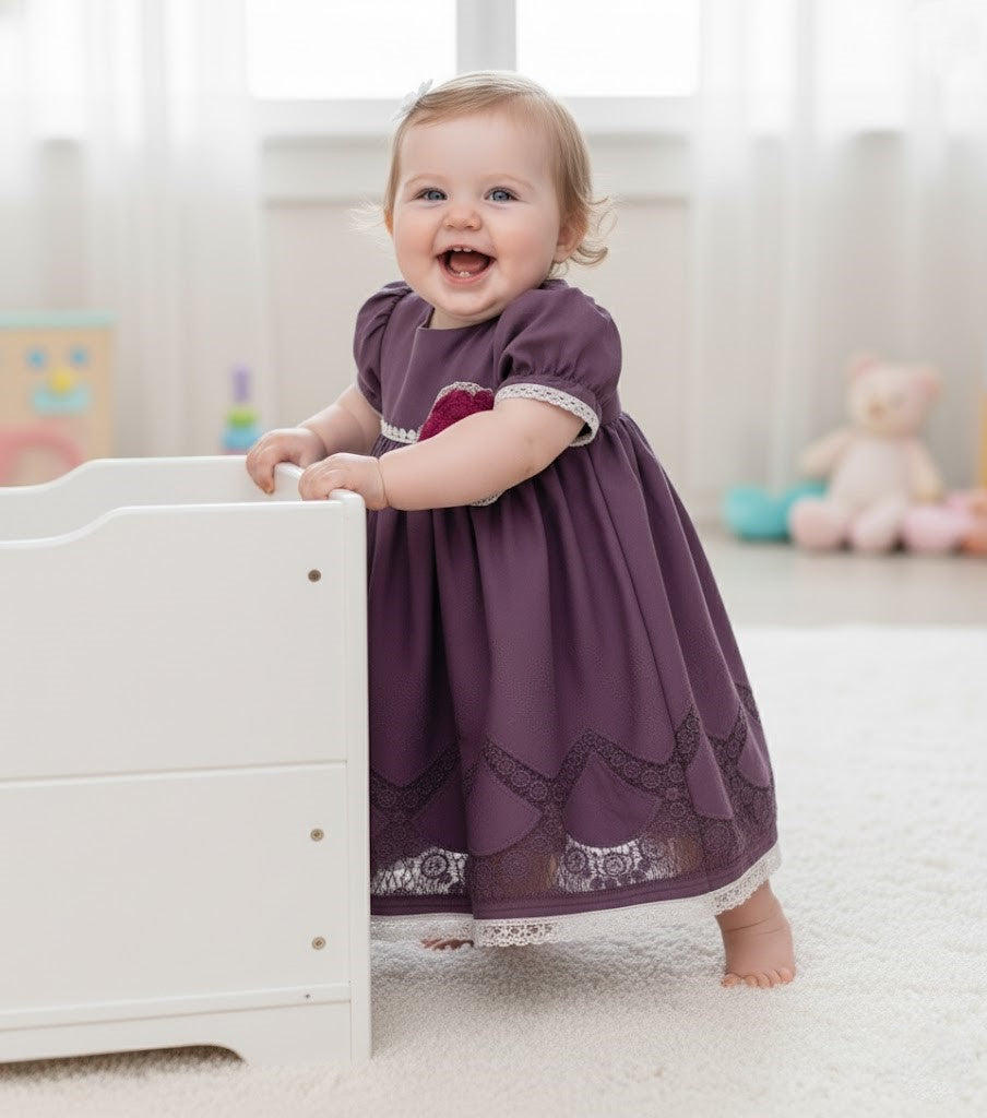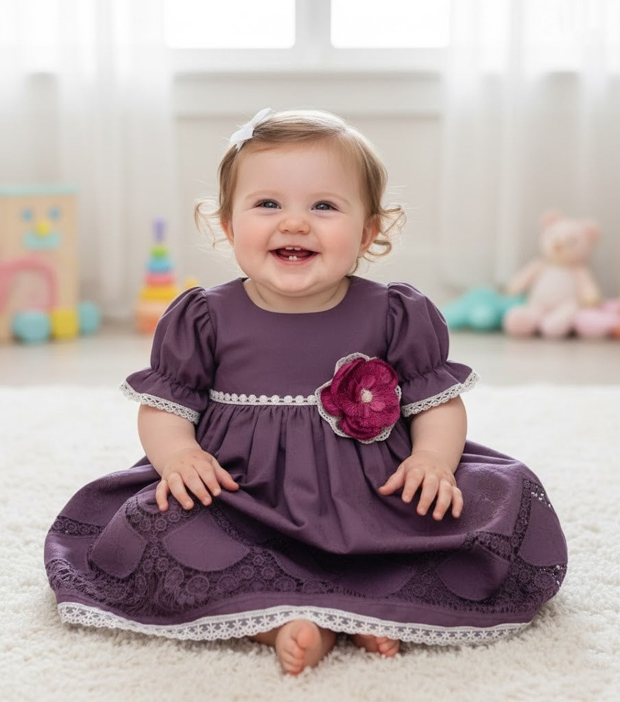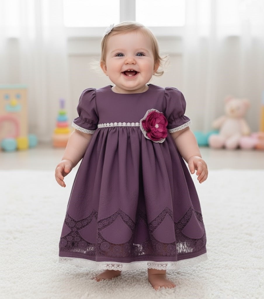 Crocheted lace and a rich purple fabric bring a classic look to life in this baby gown.